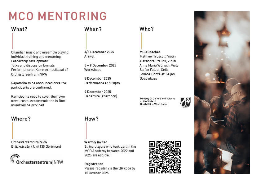 ACHTUNG: Der Anmeldeschluss für die MCO Academy wurde verlängert! Bitte senden Sie Ihre Bewerbungsunterlagen bis zum 10.10.2025 an das Orchesterzentrum|NRW.